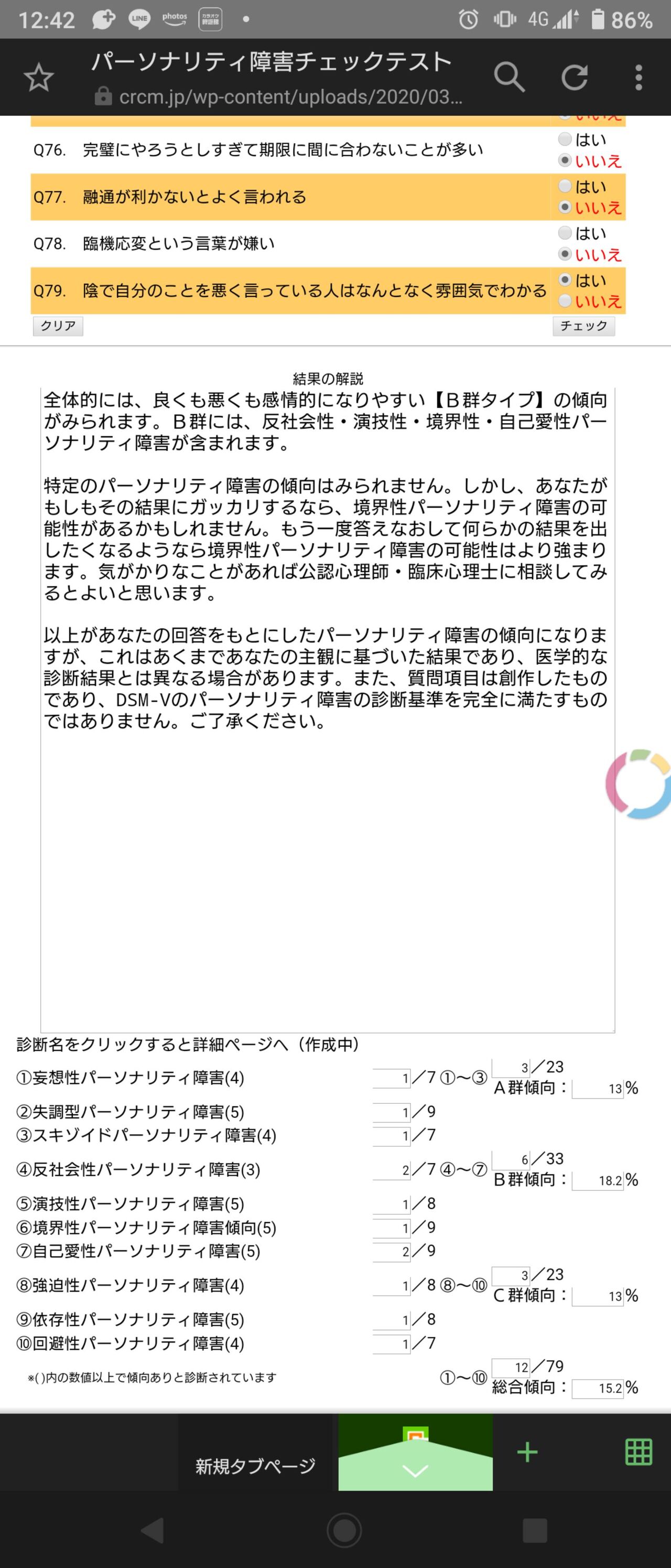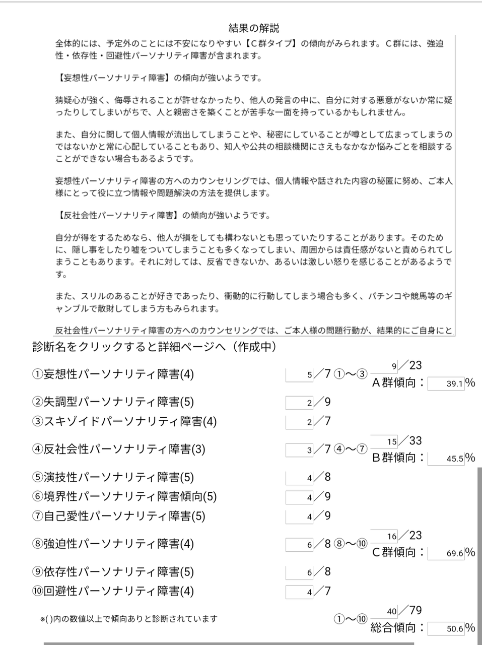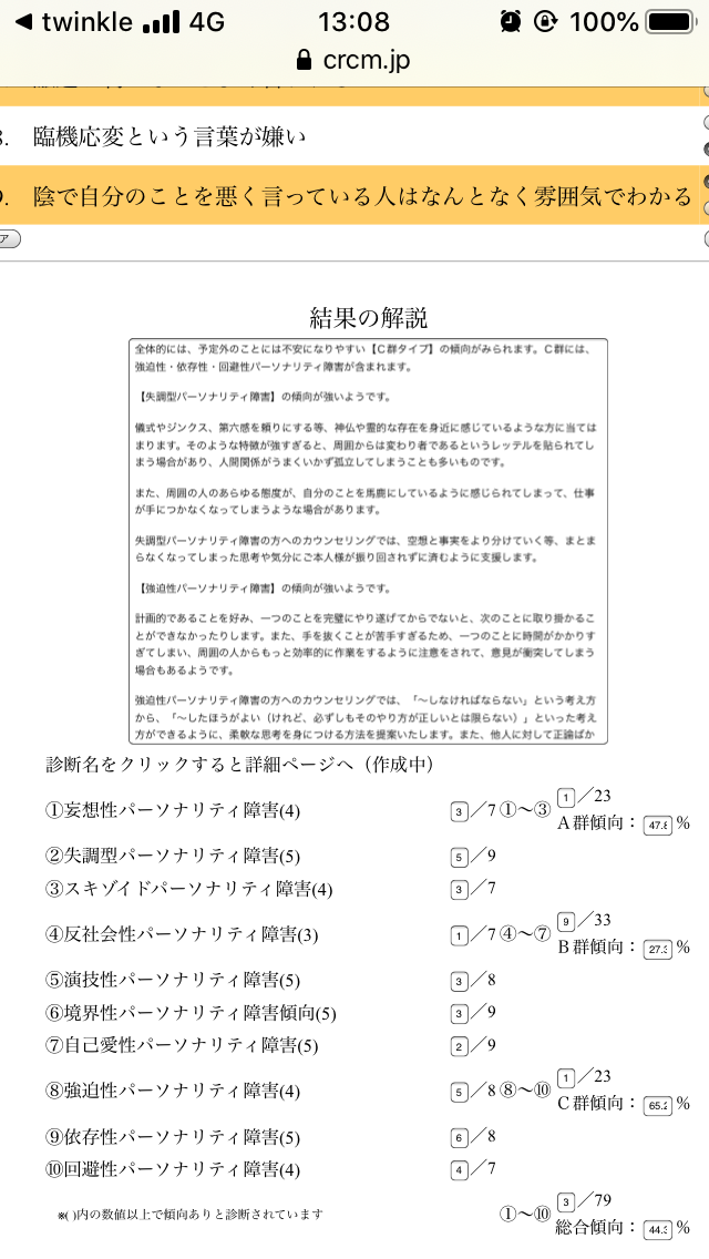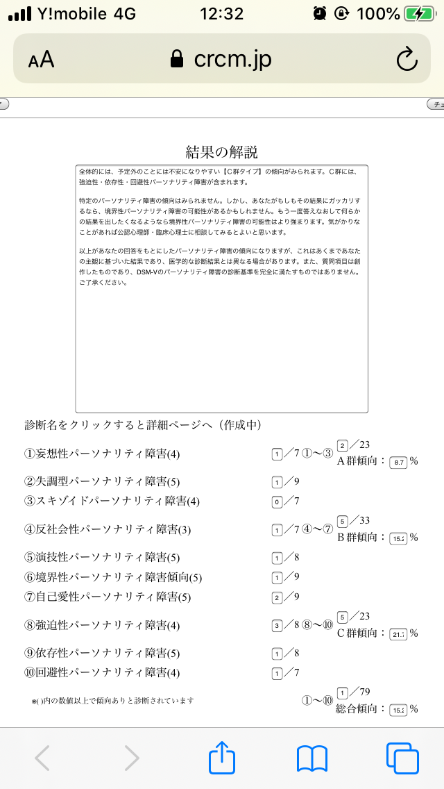 以上があなたの回答をもとにしたパーソナリティ障害の傾向になりますが、これはあくまであなたの主観に基づいた結果であり、医学的な診断結果とは異なる場合があります。また、質問項目は創作したものであり、DSM-Vのパーソナリティ障害の診断基準を完全に満たすものではありません。ご了承ください。