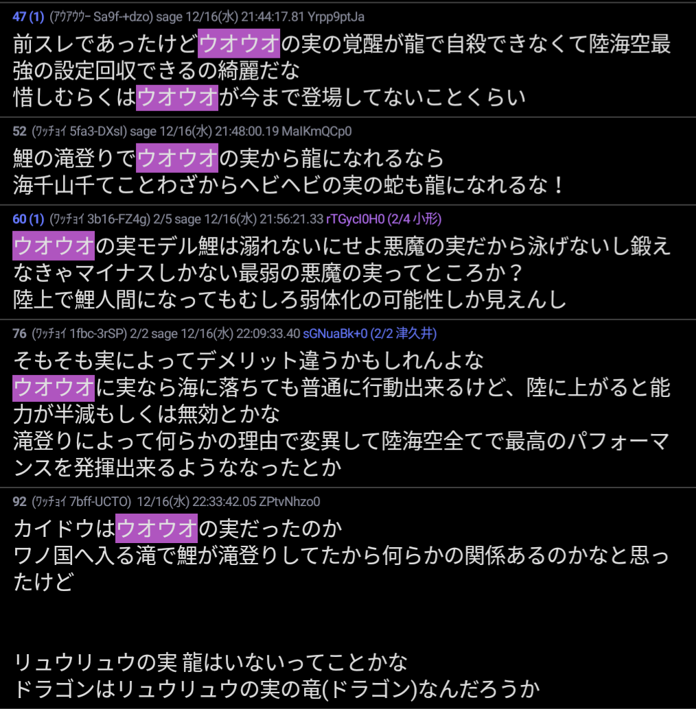 【悲報】四皇カイドウさん、ウオウオの実のモデル鯉だった 2020年12月18日 カテゴリ:アニメ・漫画 1: 風吹けば名無し 2020/12/17(木) 09:45:35.90 ID:lgKF9I7+M 999話タイトル「君のために作った待ち酒」君がため醸みし待酒 * 序盤はヤマトvsエースの回想から。 当時、カイドウは遠征中だったため、鬼ヶ島ではなく 本土から誘拐された子供たちを救出するために鬼ヶ島にやってきた。 親は選べないというエースの言葉に、ヤマトは「海に出て、おでんやベンチャーのように自由に生きたい」と答えた。 戦いの後、仲良くなって一緒にお酒を飲み、ルフィをはじめとする海の若き海賊たちの話をする。 * ゾロと一緒に屋上に飛ぼうとするマルコ。 * マルコは簡単にエースを思い出します。 * クイーンとキングは変身し、マルコを止めようとする。 * お玉はルフィがエースの弟であることを知る。 * ヤマトはルフィが彼女の名前にDを持っていることに言及する。 * ビッグマムは、ニコ・ロビンを生かしておくように海堂に言う。 * カイドウはビッグママに、味方のサマン族(プリン)はまだ古文が読めるのかと問う。 * カイドウが食べた果物は "魚・魚・果物交換種 "だった。モデル名は不明です...。 元々のカイドウ、魚魚の実モデル鯉からの覚醒で龍に変化 ネタバレスレ 【【悲報】四皇カイドウさん、ウオウオの実のモデル鯉だった】の続きを読む